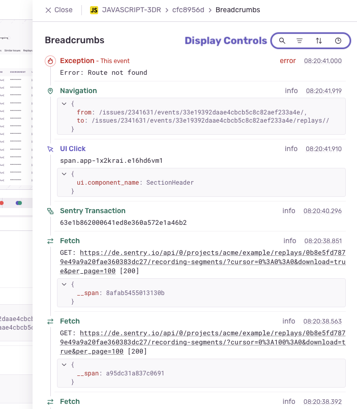 If an error event provides a trail, you'll see the breadcrumbs on the Issue Details page in Sentry.io displays .